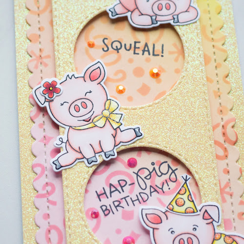 I started my background pieces by blending Distress Oxide Inks Squeezed Lemonade and Spun Sugar. Those two colors blend together nicely making a pretty light orange color! I then used Newton's Nook Designs Balloons stencil with Mustard Seed and Worn Lipstick Distress Oxide Inks. Next, I die cut a piece of pink glitter card stock using NND Slimline Frames and Windows die. I attached my ink blended panel to a piece of pink glitter card stock for a border, and then attached the pink glitter windows to the ink blended panel with foam tape for some dimension.